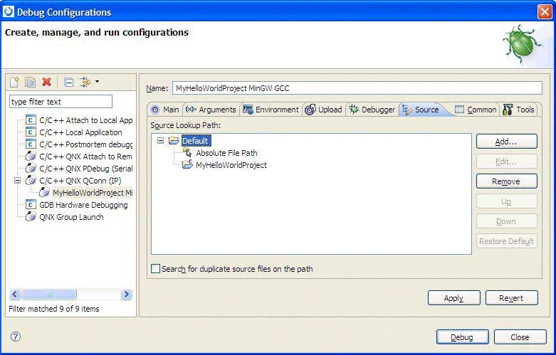 The Source tab lets you specify where the debugger should look for source files. By default, the debugger uses the source