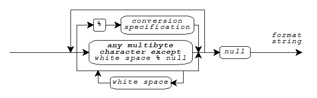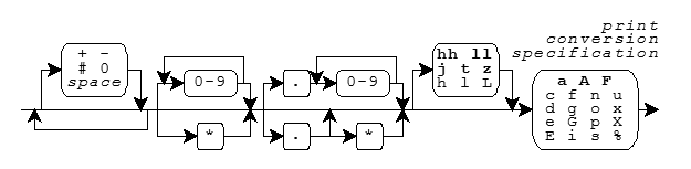 A format string has the same syntax for both the print functions and the scan functions, as shown in the diagram.